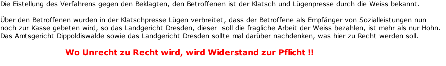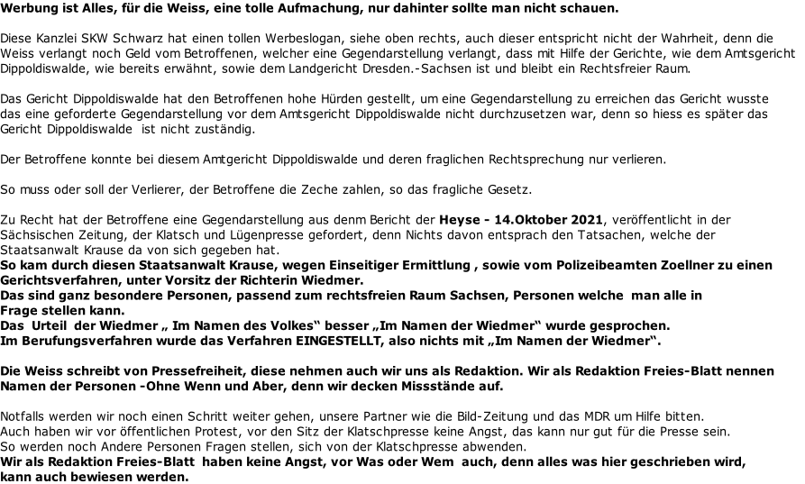 Diese Anwältin hat sich mit X-Seiten ausgelassen, welche Rechte man als Betroffener betreffs einer Gegendarstellung hat, nämlich Keine. Weiss hat Passagen des Betroffenen nur einfach wiederholt, eine schwache Kür, wie so vieles aus dem Westen.